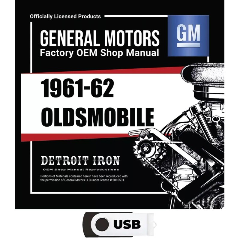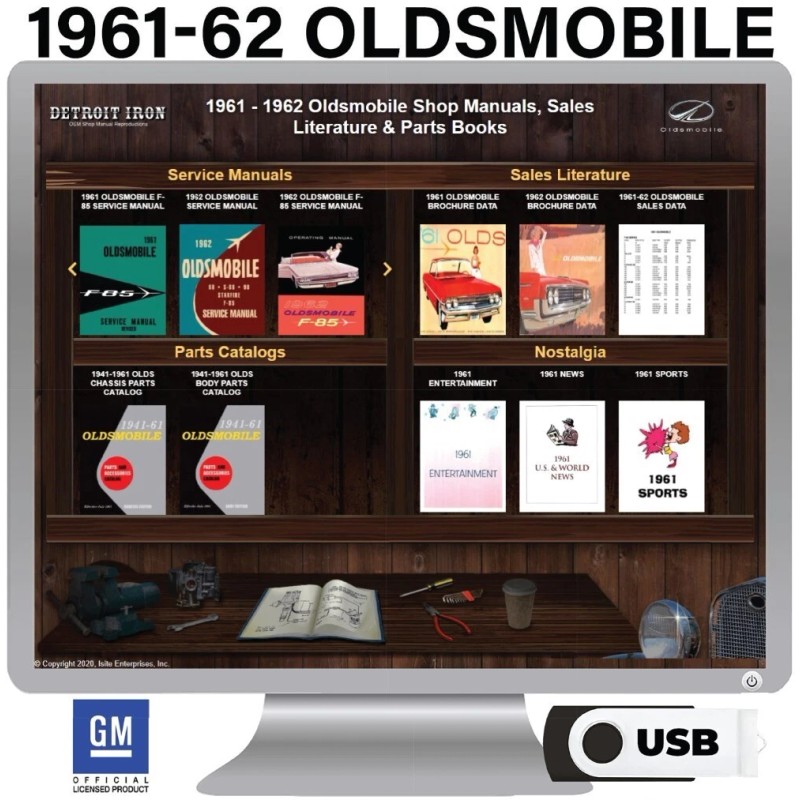 The 1961-1962 Oldsmobile Shop Manuals, Sales Literature & Parts Books on USB is a digital product published by Detroit Iron and licensed by GM. This Detroit Iron digital product provides a full set of original equipment manufacturer (OEM) repair and rebuild literature in digital / PDF format. This set of manuals and literature were originally authored and published by the car / truck manufacturer to be used by their dealership mechanics so they are very comprehensive. It features an easy-to-use bookcase in a garage scene containing a seto of PDF manuals, catalogs, brochures and nostalgia for a specific year, make and model range.