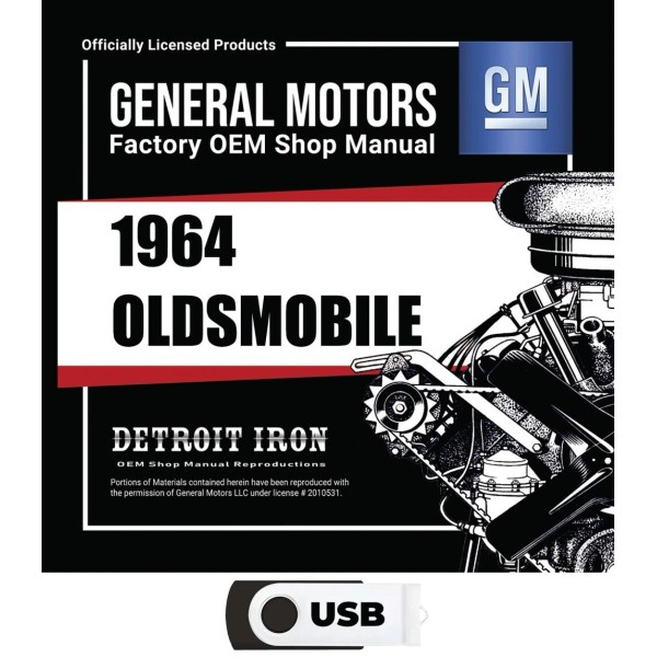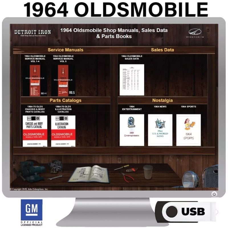 The 1964 Oldsmobile Shop Manual, Sales Data & Parts Books on USB is a digital product published by Detroit Iron and licensed by GM. This Detroit Iron digital product provides a full set of original equipment manufacturer (OEM) repair and rebuild literature in digital / PDF format. This set of manuals and literature were originally authored and published by the car / truck manufacturer to be used by their dealership mechanics so they are very comprehensive. It features an easy-to-use bookcase in a garage scene containing a seto of PDF manuals, catalogs, brochures and nostalgia for a specific year, make and model range.