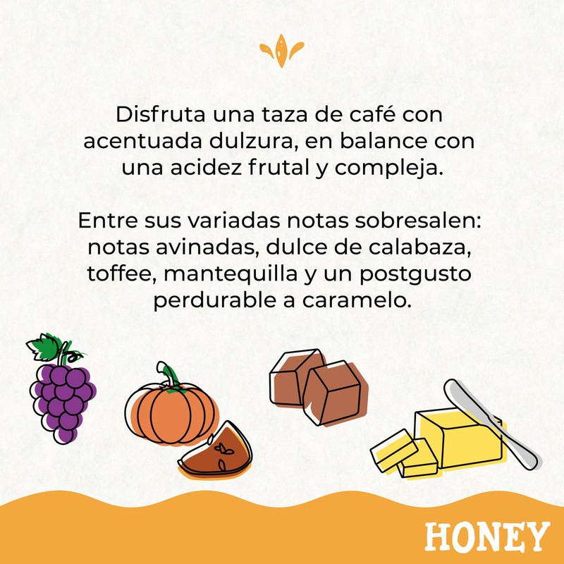 - â PERFIL DE TAZA. En cafĂ© 1968 Honey sobresalen notas avinadas, dulce de calabaza, toffee, fruta confitada, mantequilla, un cuerpo denso y un postgusto perdurable a caramelo.