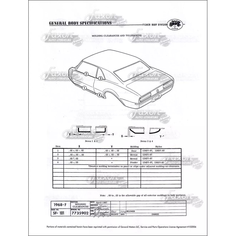 This assembly manual was written by GM engineers for use in the Fisher Body assembly plant. It gives you specifications for clearances, operating effort, leak testing, and torque.