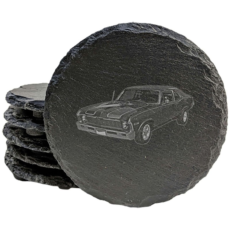 Own a piece of automotive history with these one-of-a-kind slate coasters, featuring a stunning laser-etched image of a legendary 1969 Chevy Nova.