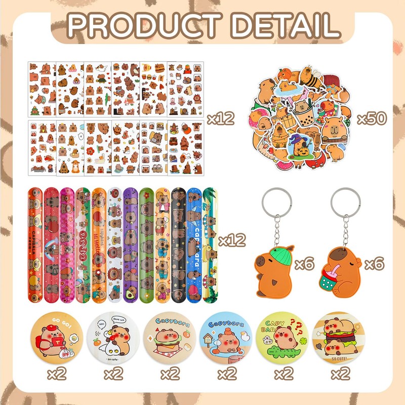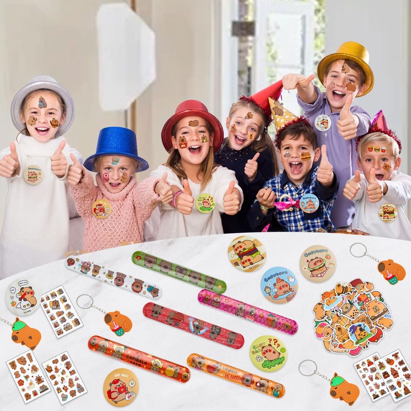 - 【Ultimate Capybara Party Kit】This all-inclusive set features 100 vibrant stickers, 24 slap bracelets, 24 keychains, 24 badges, 24 temporary tattoo sheets. Perfect for capybara-themed parties, school events, or fun giveaways.