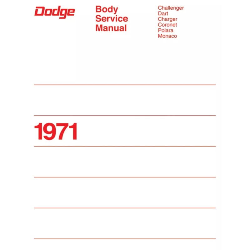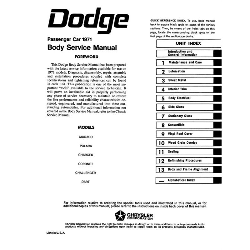 With the 1971 Dodge Body Service Manual in your toolbox, you have the most comprehensive literature at your fingertips to take on the most challenging repair, service and restoration projects. This factory written Detroit Iron shop manual is perfect for the restorer or anyone working on one of these vehicles.