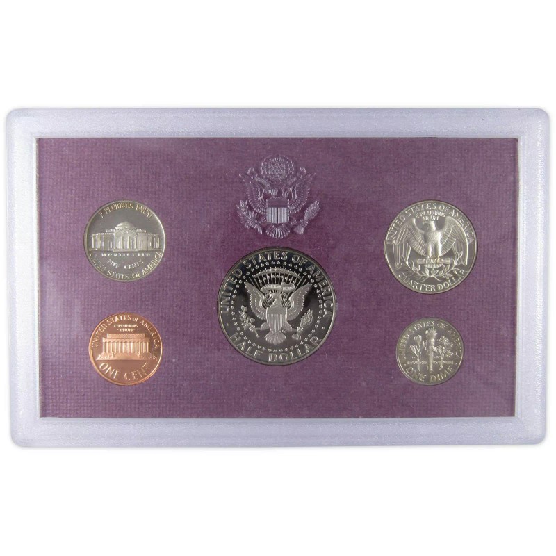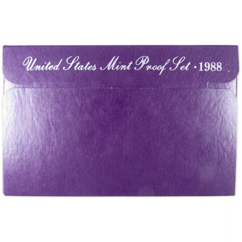 This official 1988 U.S. Mint 5 coin Proof Set contains a Kennedy half dollar, Washington quarter, Roosevelt dime, Jefferson nickel and Lincoln cent. All coins bear the San Francisco "S" mint mark, and feature extra sharp images and mirror-like surfaces. The half dollar, quarter and dime are all copper-nickel clad. Comes with the original U.S. Mint packaging. Please note that Proof Sets prior to 1990 did not include a certificate of authenticity.