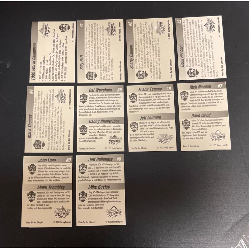 Limited print run for the 1992 IHRA factory sets from Racing Legends. Each set serial numbered out of 7500. Your serial number may differ from photos as I have multiples. Also included is the 10 card World Champions subset which wasn’t included in the factory sets but was included in the Gold edition.
