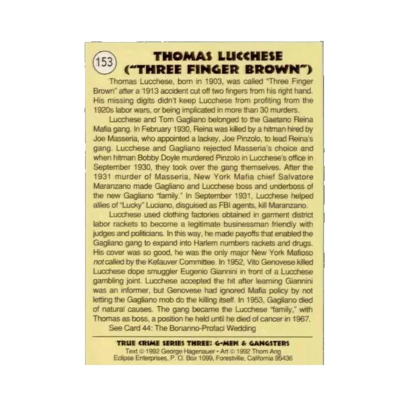 1992 True Crime Series 3, G-Men and Gangsters Trading Card #153--THOMAS LUCCHESE
