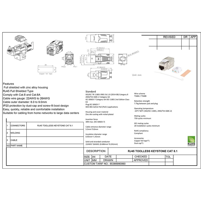- CAT 8 Keystone - Tool-free Connection LSA Terminal Block RJ45 Socket (8P8C) Signal Transmission Max 2000 MHz STP Shielding Shockproof Zinc Pressure Housing