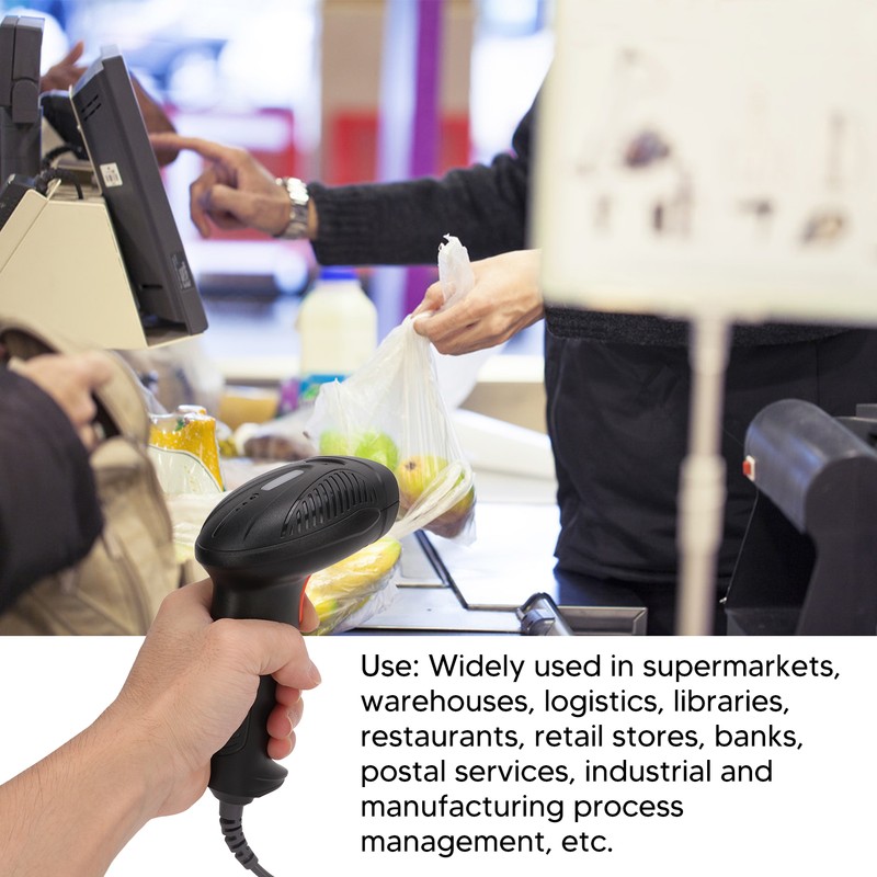 1、Ergonomic Design: The design of the barcode scanner respects and conforms to the ergonomic design, bringing as much comfort and convenience to the user as possible when using it. 2、ABS Material: This barcode scanner is made of ABS and durable plastic, which is very durable and not easy to break, and has a long service life for long term use. 3、Sonorous Beep: The barcode scanner is scanned and the buzzer will sound a di alert sound, which is clear and pleasant, avoiding missed transmission and improving the efficiency of the original use as much as possible. 4、Plug and Play: The barcode scanner is plugging and playing, just plug the barcode scanner into your computer and start working. No driver is required, so the design is very thoughtful. 5、Application: Widely used in supermarkets, warehouses, logistics, libraries, restaurants, retail stores, banks, postal services, industrial and manufacturing process management, etc.