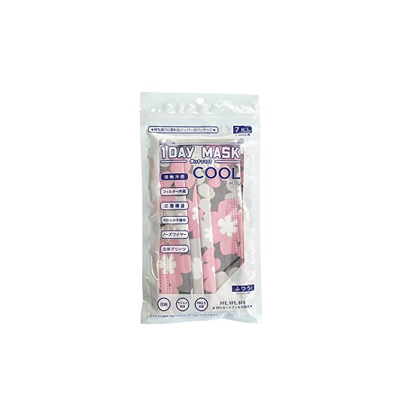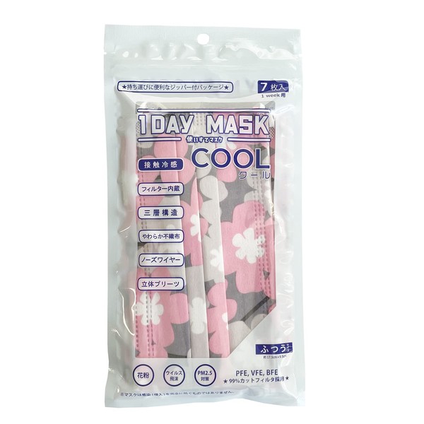 1DAY MASK COOL Normal Size FLOWER-GY/PK, 7 Pieces Per Bag, Set of 2 Bags, Cool Feeling Non-Woven Mask, Pattern Mask