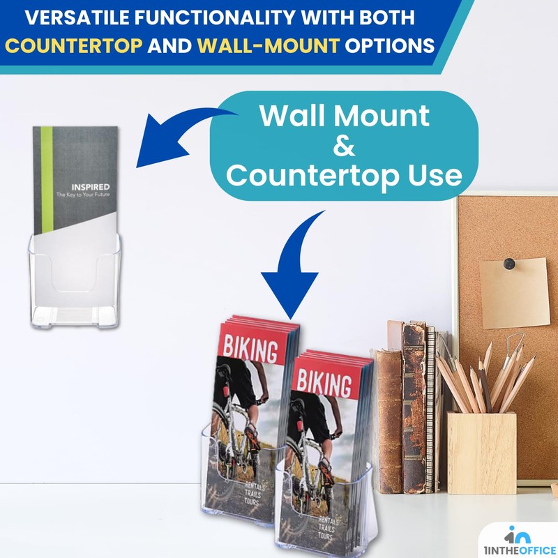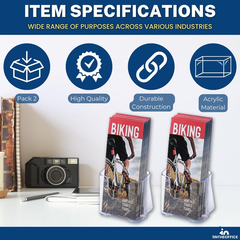 The 1InTheOffice Acrylic Brochure Holder offers a sleek and professional solution for displaying pamphlets and brochures. Designed to fit materials up to 4 inches wide and 3 inches deep, this versatile holder can be used on a countertop or easily mounted on the wall for space-saving organization. Its clear acrylic construction provides durability while offering a clean, unobstructed view of the contents. Perfect for office reception areas, trade shows, or retail spaces, the brochure holder enhances visibility and accessibility to marketing materials. The lightweight design makes it easy to move or install, while the 2-pack option ensures you have multiple display solutions. Whether for personal use or professional environments, this brochure holder is an ideal choice for pamphlet organization and marketing display. Its compact size ensures it fits seamlessly into any setting.