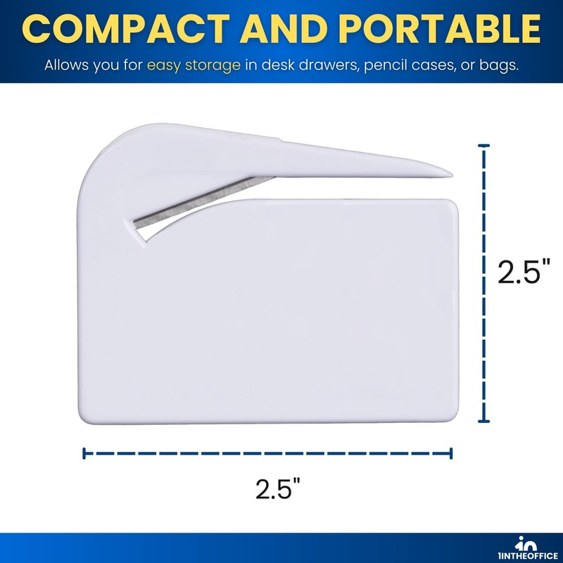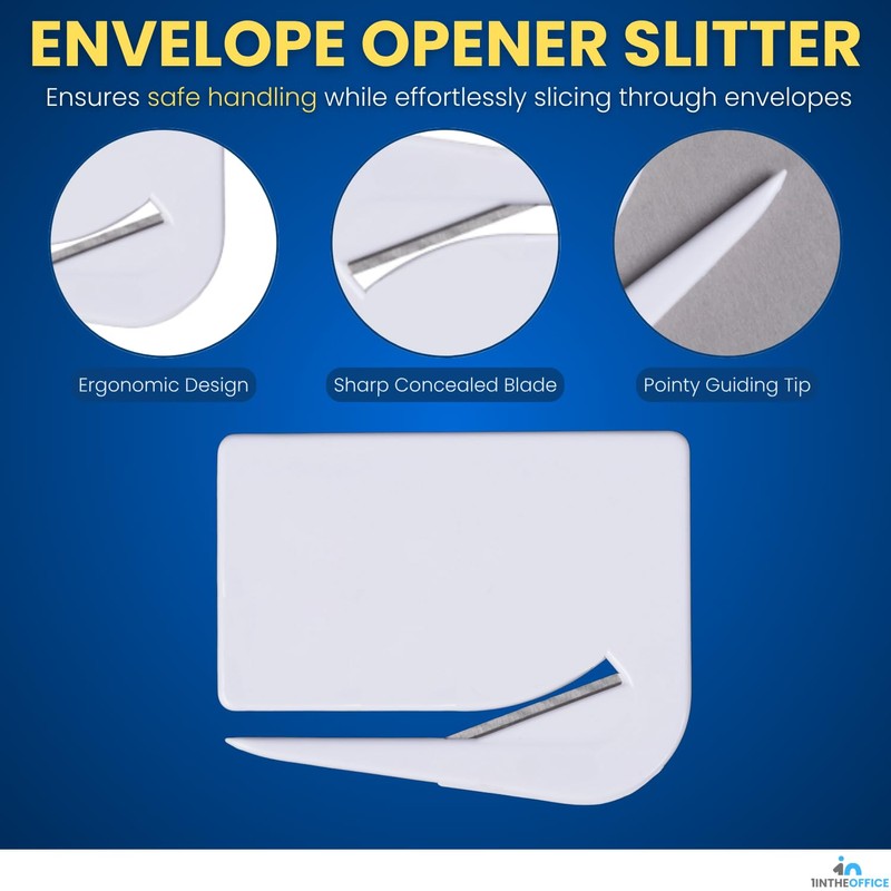 Effortlessly open mail with speed, precision, and safety using the 1InTheOffice Letter Opener Slitter with Concealed Blade. Designed for home, office, and business use, this 6-pack of sleek white envelope openers is the perfect solution for anyone who processes a high volume of mail or simply wants a cleaner, faster way to handle correspondence.