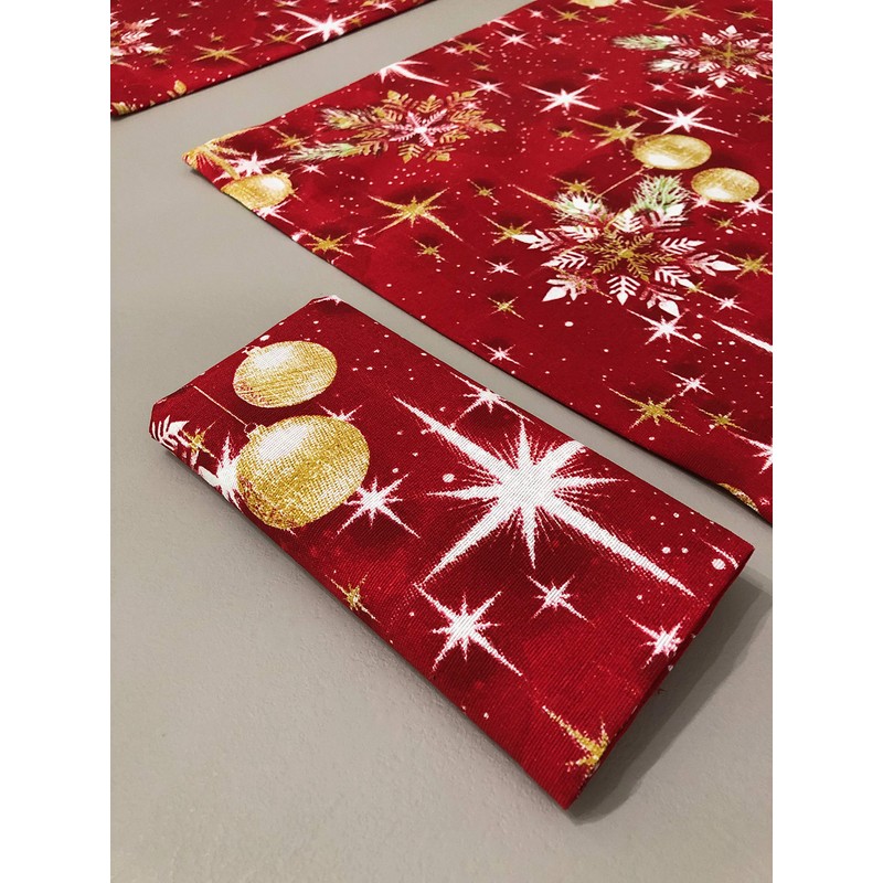 1KDreams Christmas Cotton Tablecloth Elegant and exquisite design with red background decorated with baubles, stars and gold leaf. Classic design in modern shape. Suitable for Christmas and New Year. Suitable for any environment and regular use at the table. Ideal for decorating your home and Christmas parties. Bar table cover material: 70% cotton, 30% polyester. Machine washable. Easy to clean material. Washable colours. This Christmas tablecloth will help you create an elegant atmosphere on your table. It is a perfect gift for friends and family. Can be combined with napkins, placemats and bread baskets with the same fabric and pattern. Made in Italy.