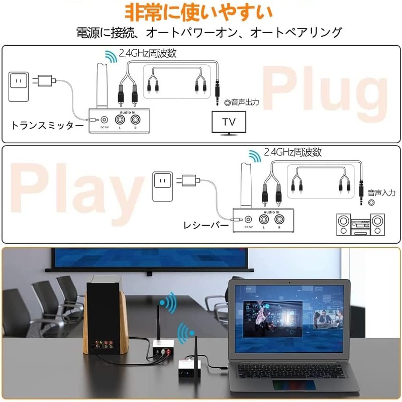 - PLUG & PLAY - 1Mii wireless transmitter receiver set with RCA input and output allows you to easily connect with your TV, DVD or MP4 to transfer audio wirelessly to your power speaker or home stereo. Very easy to use, connect the transmitter to your TV, connect the receiver to your home stereo, connect these 2 to the power supply, wireless transmitter receiver kit will automatically turn on and connect automatically. Note: Does not support HDMI
