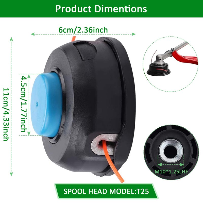 - [Product set]:You can get 1*Replacement Head in this product set,Quick Reload Without Disassembly. Please pay attention to the installation screw and nut parameters of your machine,Bolt Size: M10 x 1.25LH.Compatible with 0.065" 0.080'' 0.095" trimmer line.Simple to Use: Weed wacker attachments are simple to attach, Reload and use.