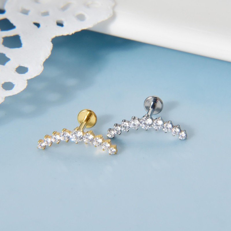 - 16G Cartilage Piercing Jewellery with 9 Clear Cubic Zirconia: Post thickness 16Gauge=1.2mm(0.047"), Post length 8mm(0.31"). Curved row of CZ is about 15.6*4.8mm.