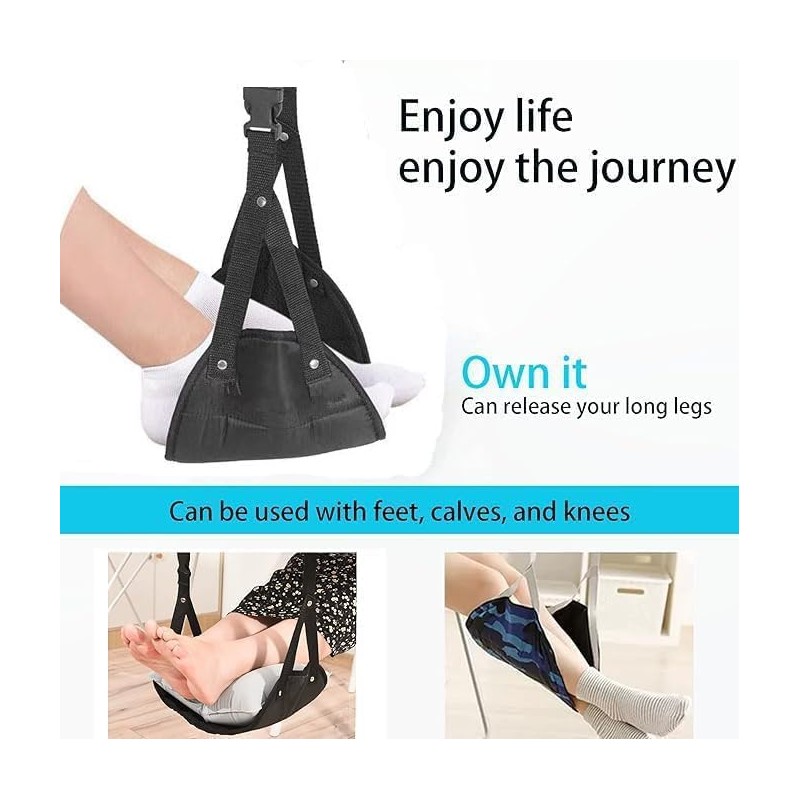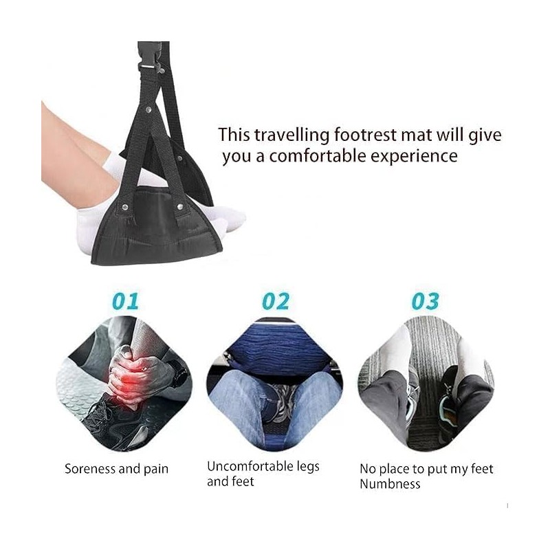 - Adjustable Straps and Ease of Use: The airplane foot hammock with adjustable straps always fits your height for optimal comfort. You can use the foot strap while flying and during train rides. Simply hang the straps on the small table in front of your seat and then rest your feet on the footrest.