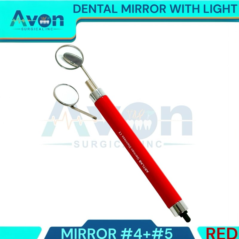 - Includes: 1 Each - oral examination mouth mirror handle with LED light built-in & mirror head #4 + #5 (red).