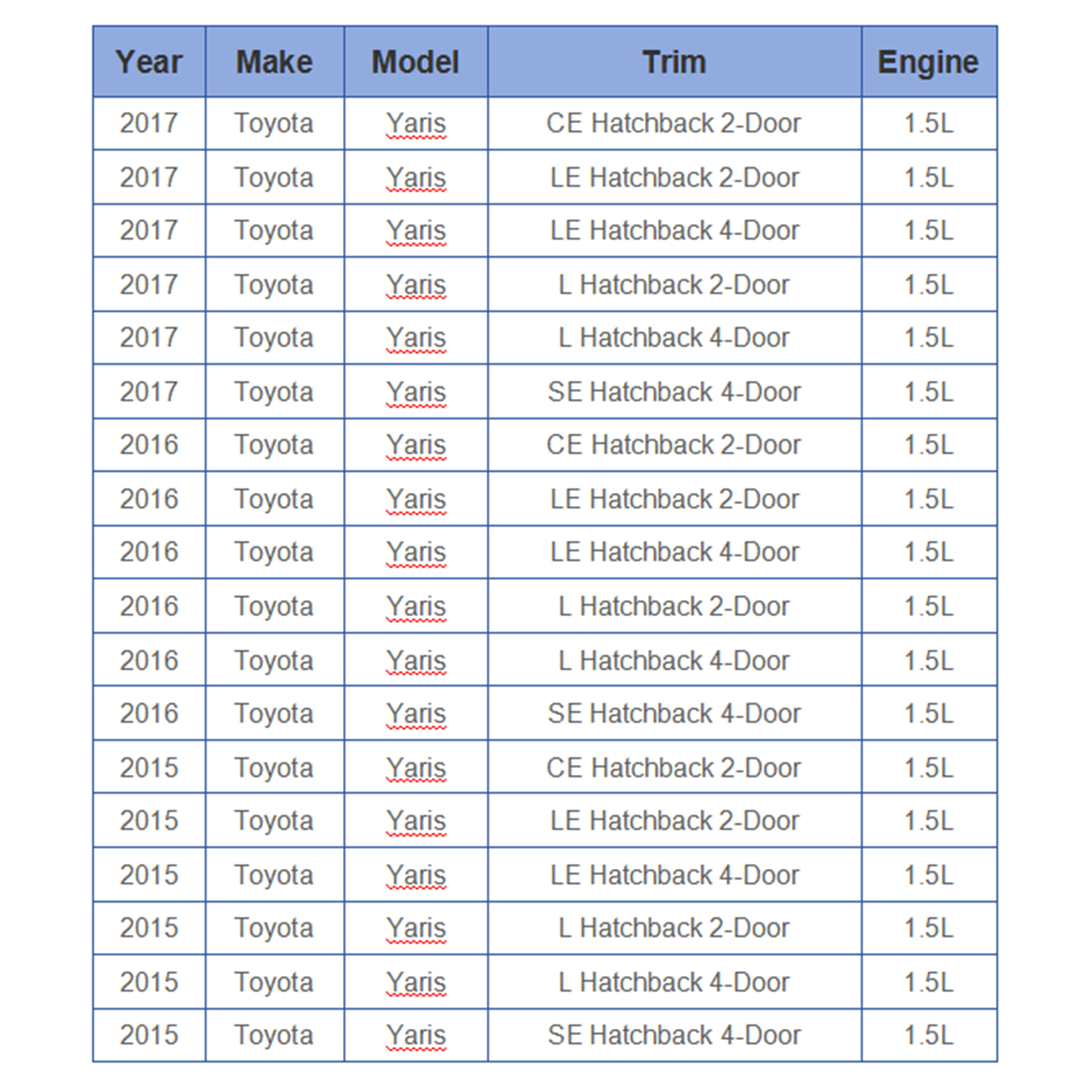 • 2015-2017 Toyota Yaris