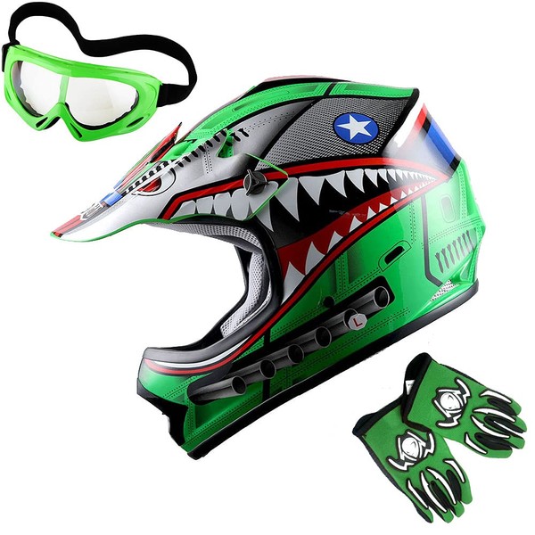 1Storm Youth Motocross Helmet Kids Motorcycle Bike Helmet Shark Green + Goggles + MG Youth Green Glove Bundle