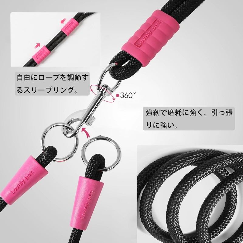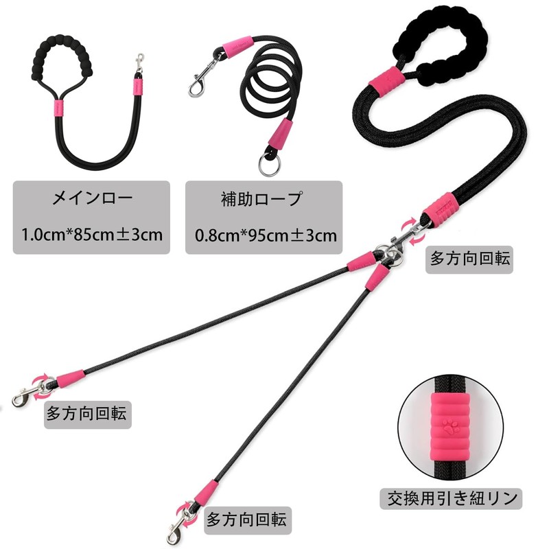 - 【両端牽引ロープ】2匹の犬を同時に散歩させることができます。金属パーツは360度回転し、愛犬が自由に動いてもねじれません。