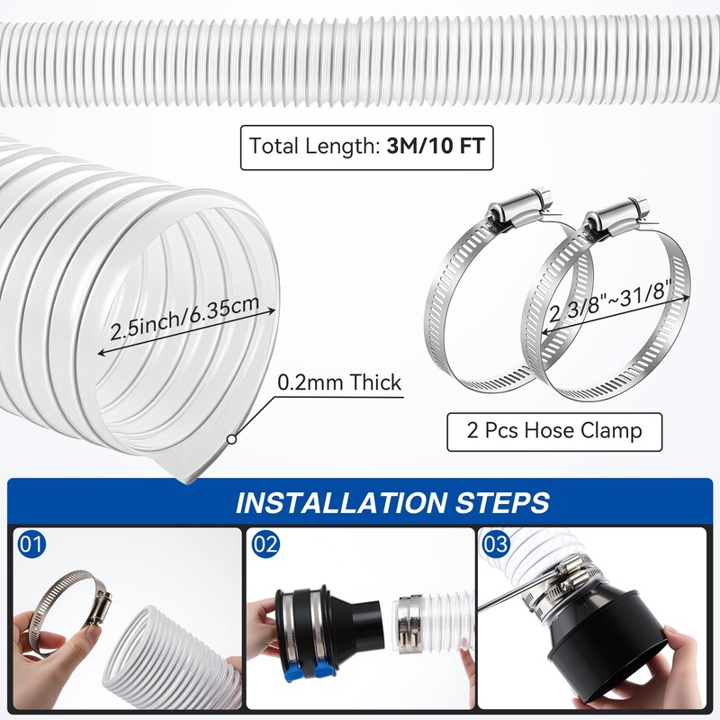 2-1/2 x10 ft PVC Dust Collection Hose with 2 Steel Hose Clamps 4 Inch to 2-1/...
