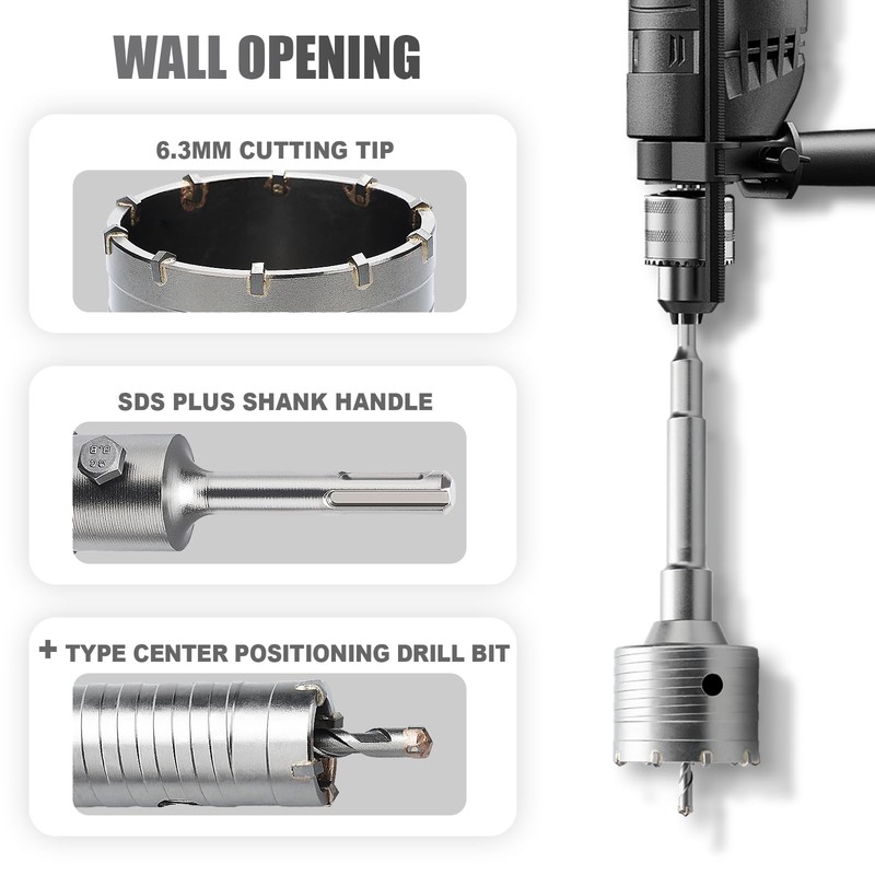- Package includes:2-1/8 inch / 54mm Concrete Hole Saw + 220mm SDS Plus Shank Connecting Rod +2 center drill bits + 2 screws +3 plastic dust bags