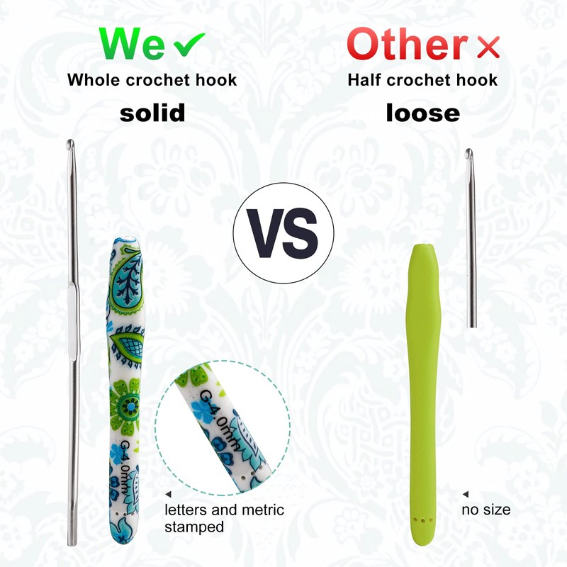 This crochet hook is the perfect starter, Whole metal crochet hook inserted in the handle, is very solid. They are beautiful and work like a charm, smooth crochet hooks glide effortlessly, produce a clean finish project and avoid snagging yarns.