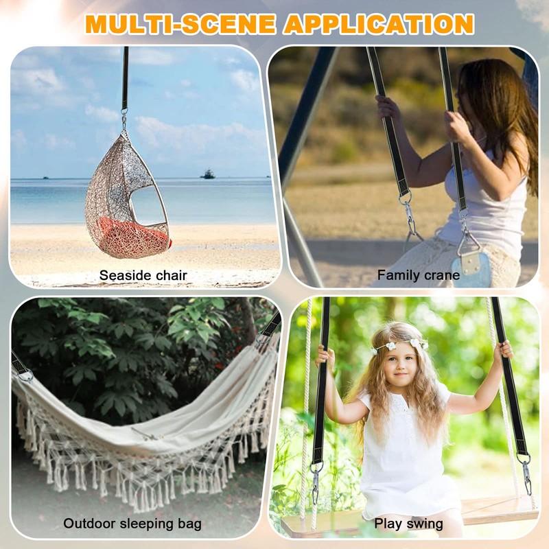 - 幅広い使い所--ブランコ用ベルト、ハンモックストラップ。室内や庭、キャンプ、アウトドアなどいろんな場所で使えます。アウトドア初心者の方でも、簡単・スピーディーにハンモックの設置や高さ調節ができる固定ロープ。一度使うと手放せないキャンプ必需品です!単体で使えばハンギングチェーンとして荷物も掛けられて便利です。