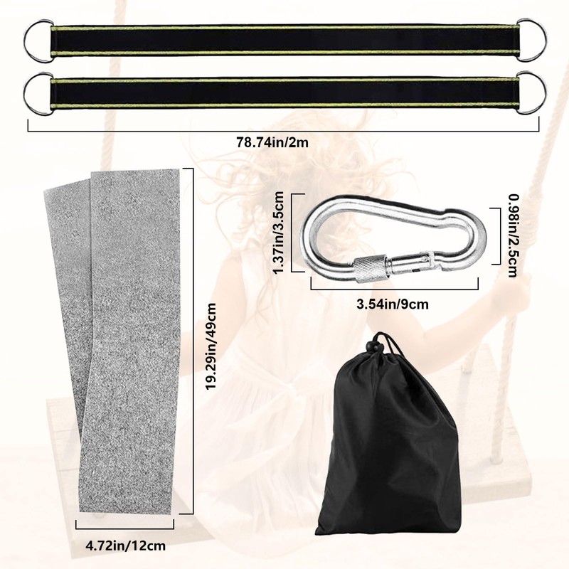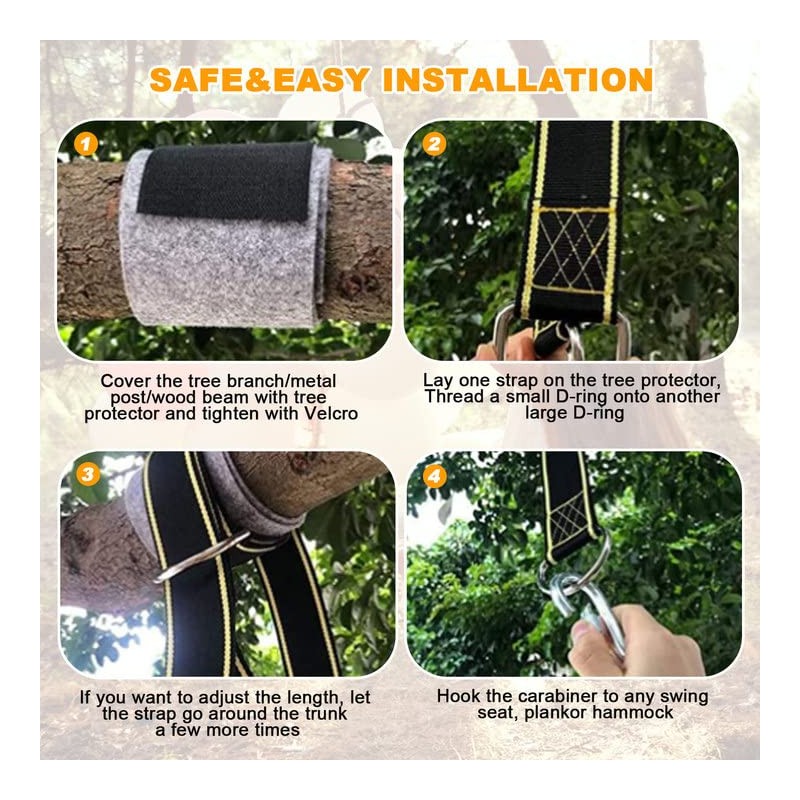 - 製品--ブランコハンモック固定用ベルト×2本、安全ロック付き カラビナ2個、ツリーパッド×2枚、専用収納バック×1個。過酷な冬や過酷な夏でも摩耗することなく使用できます。