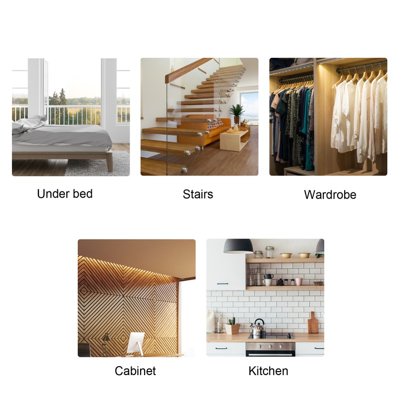 1、Auto Turn On: Motion sensor LED strip with warm and soft light, will automatically turn on when you get out of bed to guide you safely across the room in the dark. 2、Body Induction: Motion sensor LED light built in human body passive infrared (PIR) motion sensor, with automatic turn on and shut off by human induction in the dark environment. 3、Cut Freely: Each 3 LED light chips for a group, each group can be cut without affecting the normal use of other groups, which is convenient to install and will not cause waste. 4、Wide Application: Motion sensor light can be installed in anywhere you need extra light, such as under bed, stairway, cabinet, cupboard, sofa, furniture, etc. 5、High Flexibility: Motion activated LED strip light with good flexibility, can be bent into various shapes (not right Angle) without break, which is firm and sturdy for long time use.