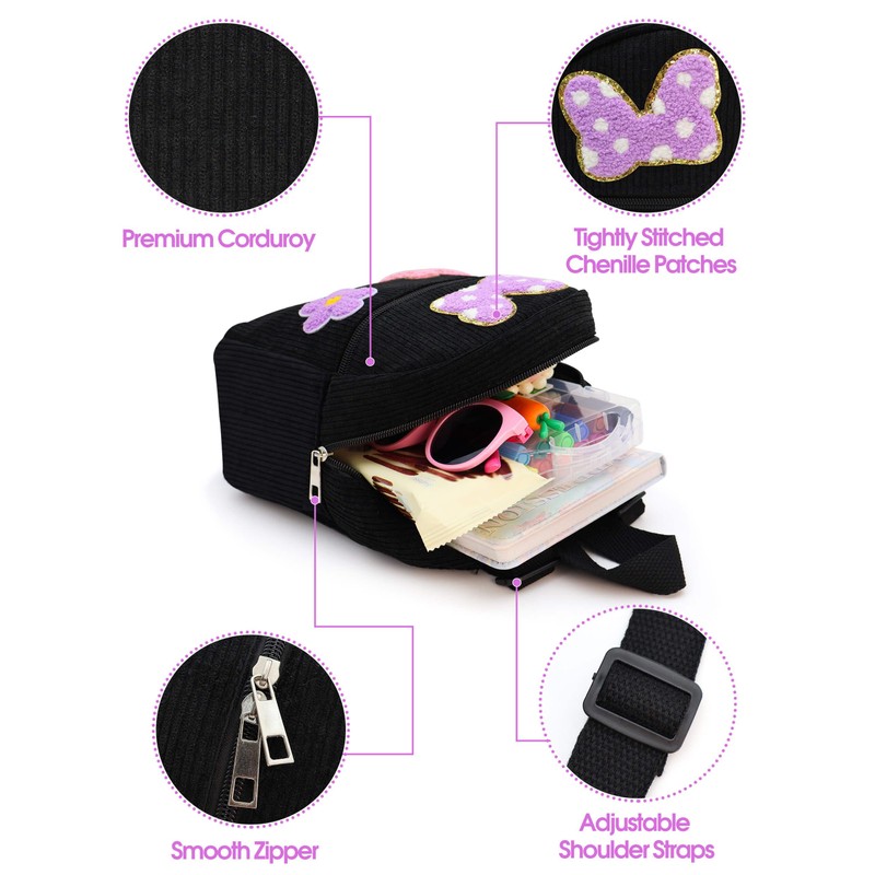 - 【Premium Corduroy Mini Toddler Backpack】: Initial mouse bow kids backpacks for little girls is made of high-quality corduroy fabric, soft to the touch, smooth two-way zipper main compartment has 1 inner pocket, 1 front zipper pocket. The mini backpack is large enough to hold toddler girls' toys, mobile phones, money, lipsticks, necklaces, earrings, sunglasses, snacks and other necessities needed for park trips, keeping her essentials organised.