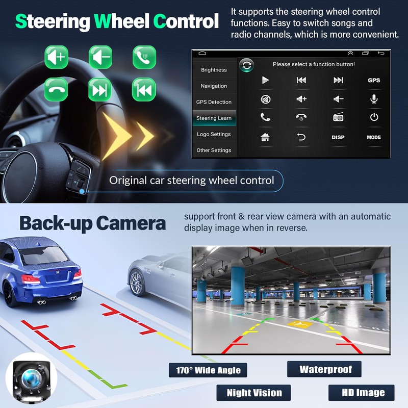 - 【Rearview Camera Input】For this Android car radio with backup camera,ready to offer 170°viewing angle backup, allowing you to see hazards such as pets, children, or mailboxes that behind your car. When you put on reverse gear, the screen of the car stereo will automatically switch to the reverse interface.Very safe and convenient when you are reversing even in a bad weather.