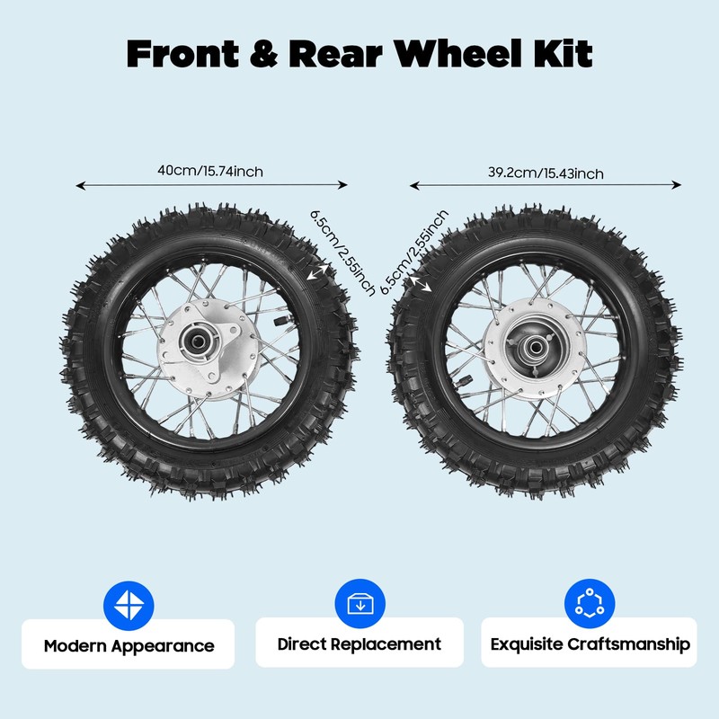 2.50-10 Front Rear Wheel Pair Set, Front Rear Tire Rim Wheel Drum Brake Pit Bike for Honda CRF50 XR50 BBR Front Rear Wheel Rim Tire Assembly w/Chain & Chain Plate Directly Replacement