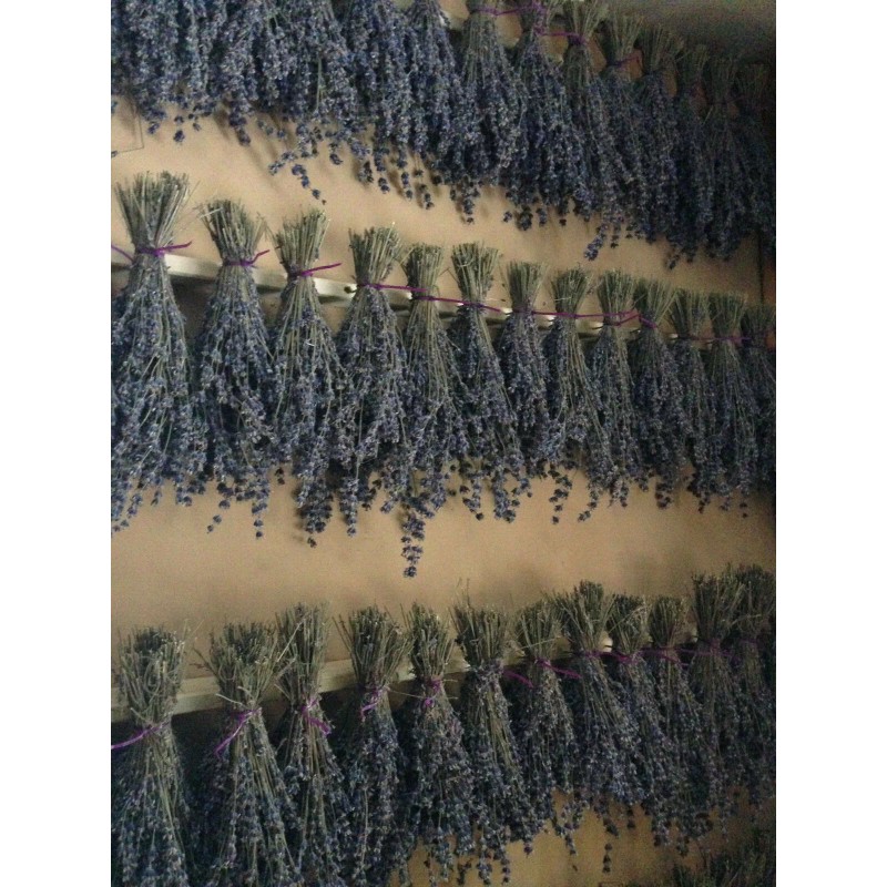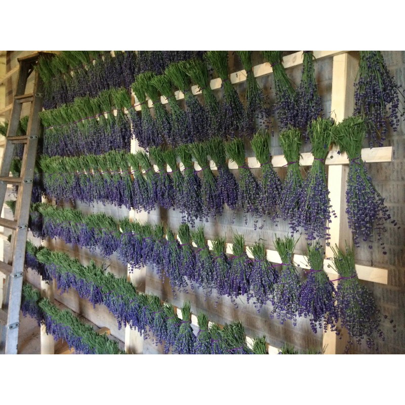 Photos shown are not the exact bunches that will be sent, but are meant to show an example of the quality and appearance you can expect. As with all lavender bunches, each one varies slightly and has its own unique characteristics. Photos show some of our lavender growing, lavender drying on the rack, and packaged lavender. Before shipping, the purple ties are trimmed, the bunches are cleaned, and then wrapped/sealed in a clear air-tight packaging.