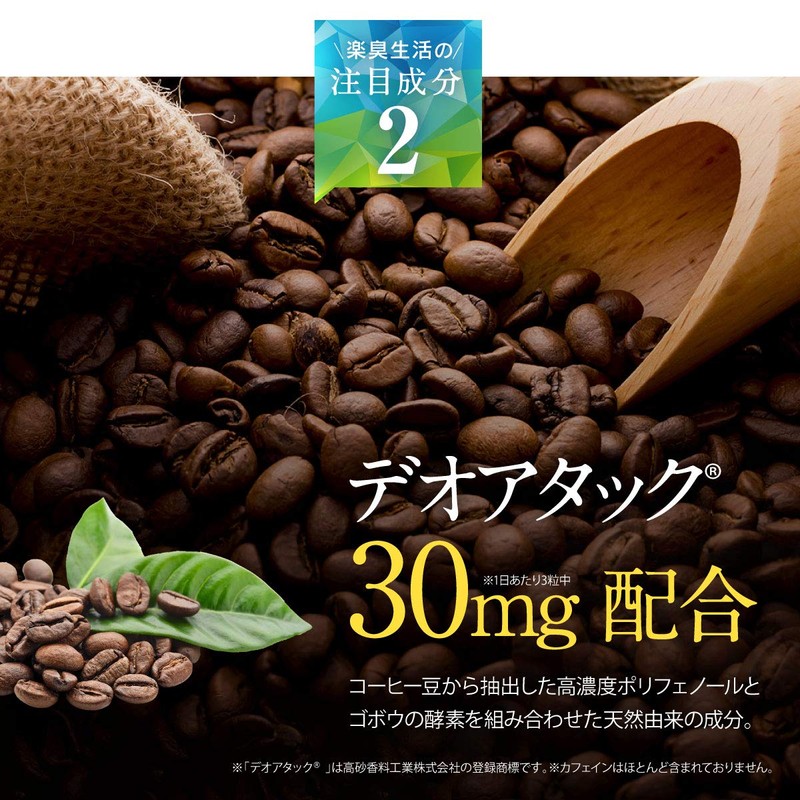 • エチケット対策にオススメのサプリメントです。「楽臭生活」は150倍濃縮のシャンピニオンエキスを、1回3粒あたり225mgと高配合し、天然由来の成分デオアタックを30mgも配合。さらに、2019年秋のリニューアルに当たり、レモンの香りをプラス。