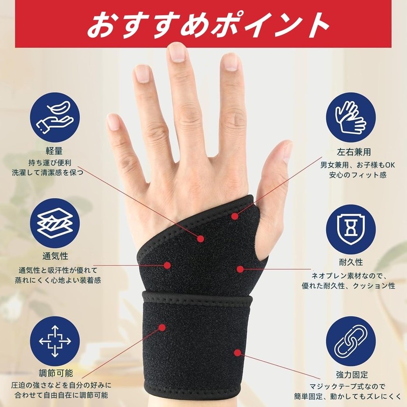 - 《調節可能》:マジックテープ式で簡単に装着でき、手首の太さに合わせて自由に調整可能、左右兼用設計。