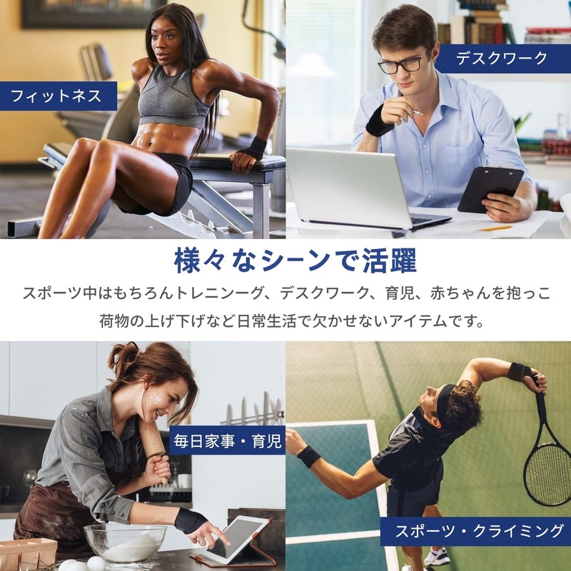 テニス、野球、バドミントン、バスケットボール、卓球などのスポーツ時の怪我防止や、デスクワーク時の手首の負担軽減に効果的です。