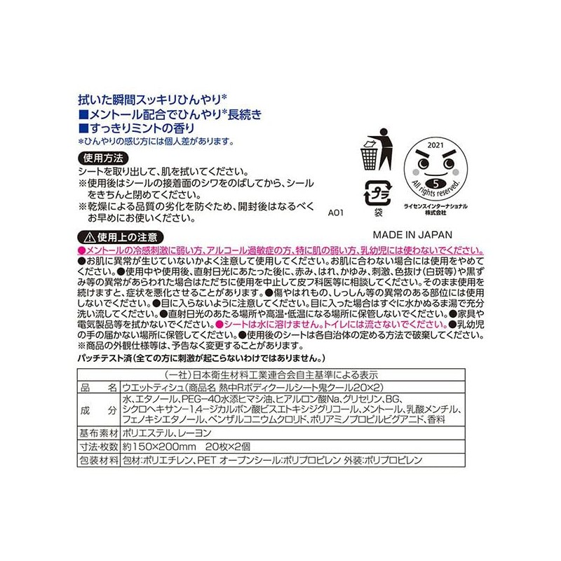 "2 Bag Set" Gekikyo-kun Heat Rescue Body Cool Sheet Demon Cool 20 Sheets x 2P Lec Cooling Supplies