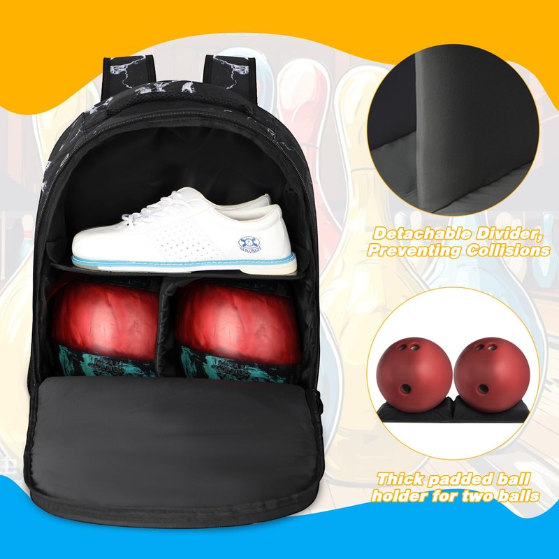 2 Ball Bowling Backpack,Bowling Ball Bag with Shoe Compartment & Portective Foam Padded, Fits Bowling Shoes Up to US Mens Size 16 and Accessories