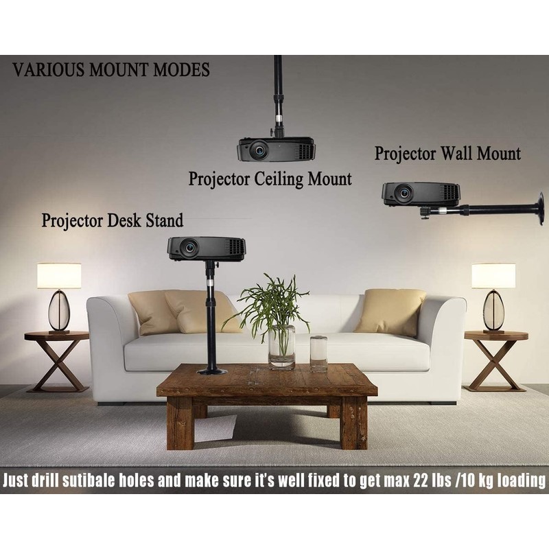 - 5.GREAT FOR PROJECTION-The video projector mount is designed for wall or ceiling with Anti-shake Design and Reinforced Base with a loading capacity about 12lbs /5.4kg. Eligible for almost all projectors, mini projectors, cameras with one mounting hole.