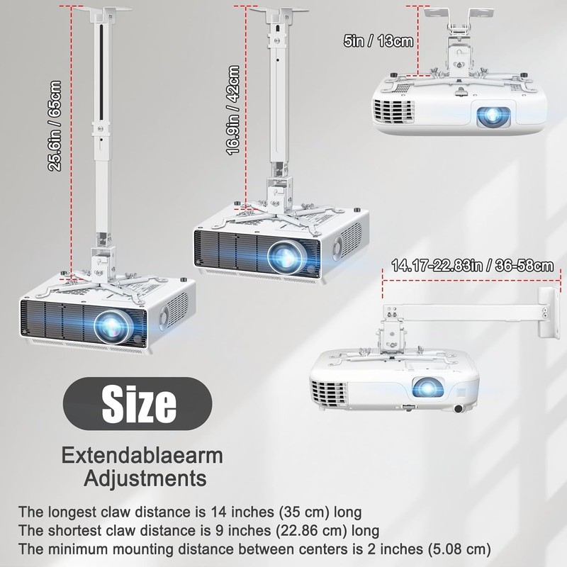 - 4. Extension Height / Length: As projector drop ceiling mount with height from 16.9 inches to 25.6 inches (42cm to 65cm). As projector wall mount with length from 14.17inches to 22.83 inches (36cm to 58cm) Tip: if you use max wall mounting length, please add a screw in the middle to advoid sagging