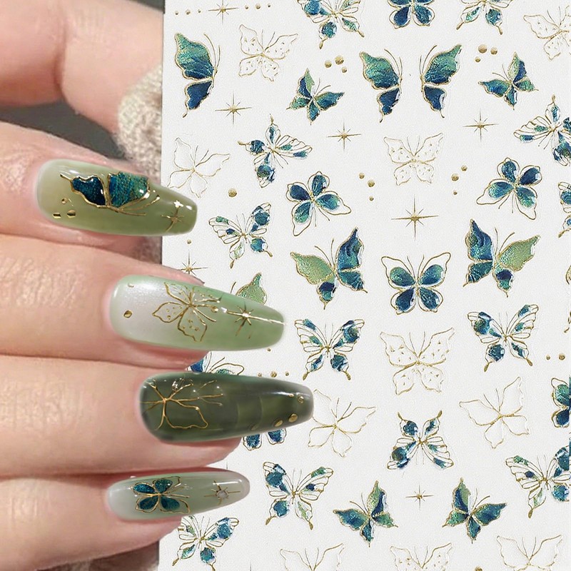 2 Blatt Nagelsticker Schmetterling Deko, Nail Sticker Selbstklebend mit 5D Geprägte Design, Glänzend Nail Art Nagelaufkleber für Kinder Mädchen Frauen (Smaragdstern)