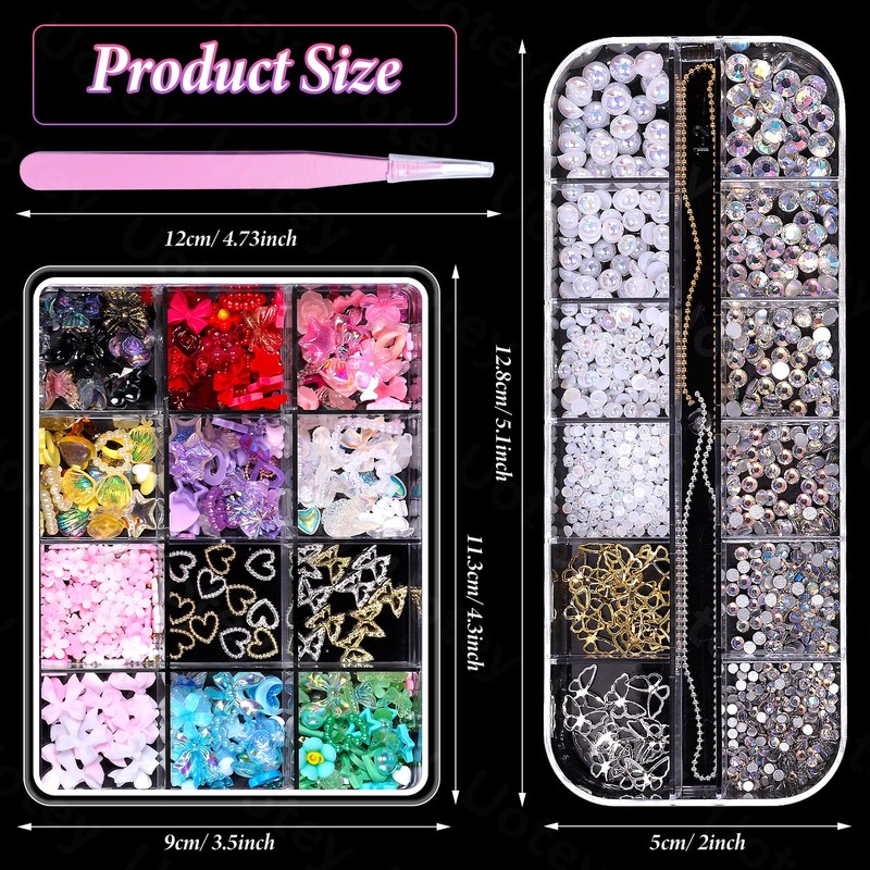 • What You Get: 2 boxes nail charms and rhinestones with tweezers. 1 box round flatback nail gems rhinestones and pearl nail charms. 1 box acrylic color flower bows nail charms and metal butterfly heart nail charms