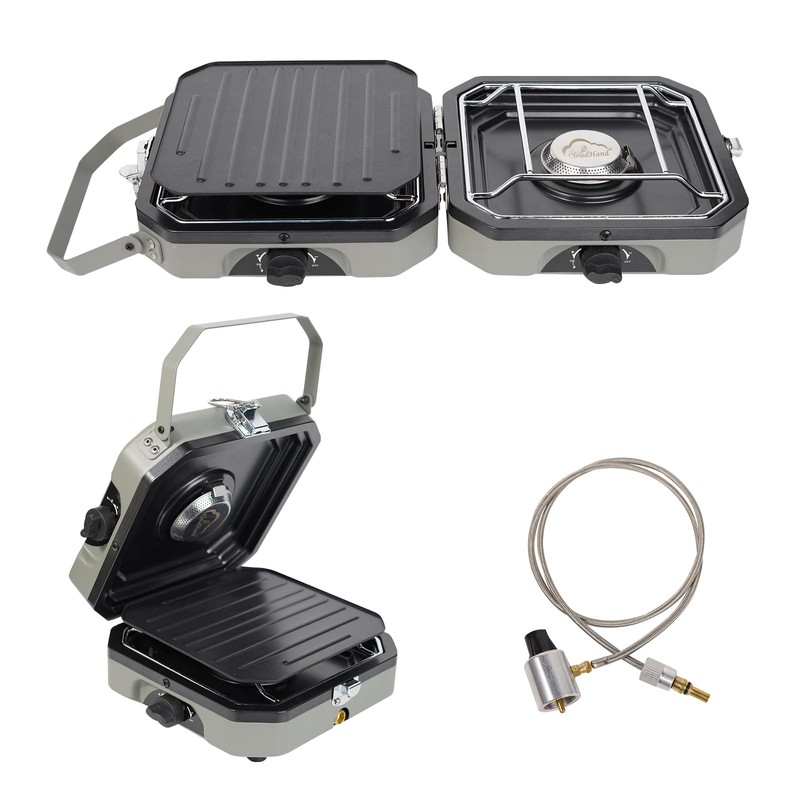 2 Burner Propane Camping Stove with Grill - CloudHand Foldable Camp Stove with 16,000 BTU, Two Adjustable Burners with Piezo Ignition & Easy Carrying Handle Grey