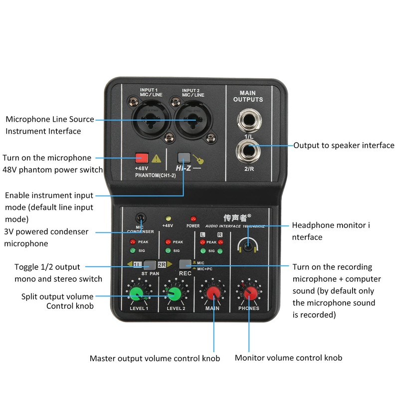 3. USB Power Supply: Audio mixer sound board uses USB to connect to the computer and supply power, which is more convenient to use.