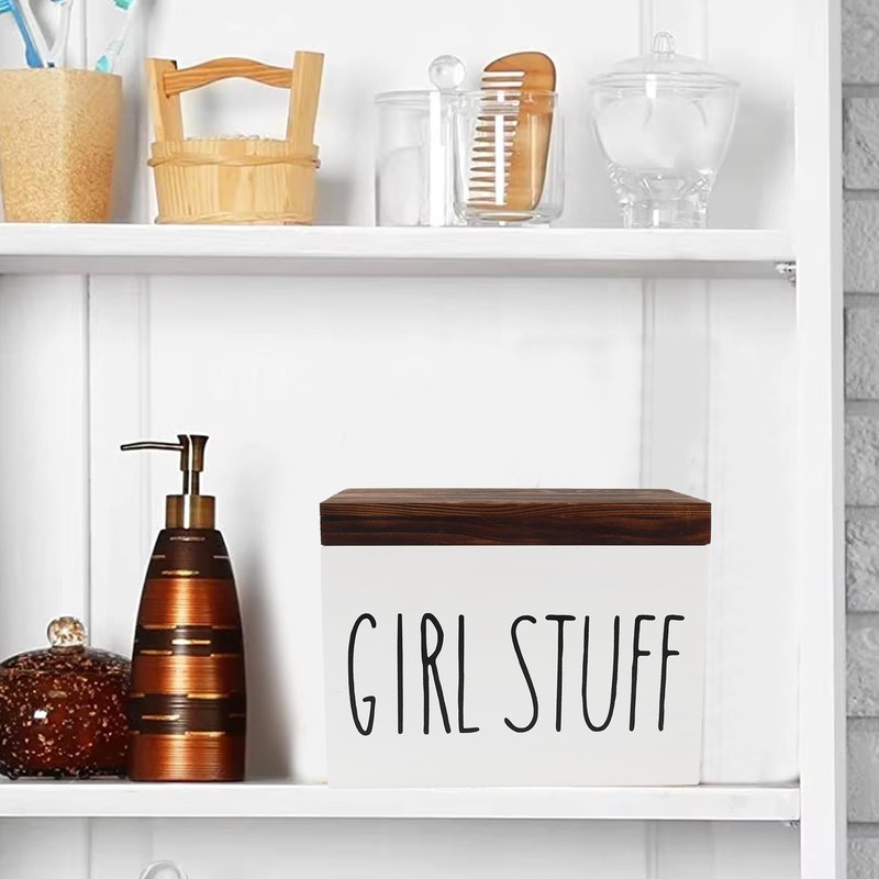 MULTIFUNCTIONAL & SPACE SAVING Two compartments not only organize women's hygiene, but also cotton pads, cotton swabs, cosmetics or hair accessories. Perfect for bedside table, bathroom shelf or closet.