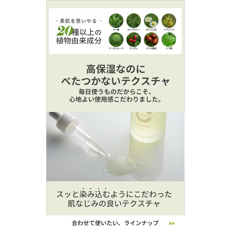 ビタミンC×話題成分×植物の力で、肌悩みに集中アプローチする高機能美容液。 化粧水で整えた肌にすっとなじみ、角層のすみずみまでうるおいと美容成分を届けることで、肌本来の輝きを最大限に引き出します。