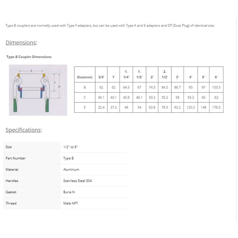2" Female Camlock x 2" Male NPT Aluminum Type B Camlock with Stainless Steel Handles and Extra Seal