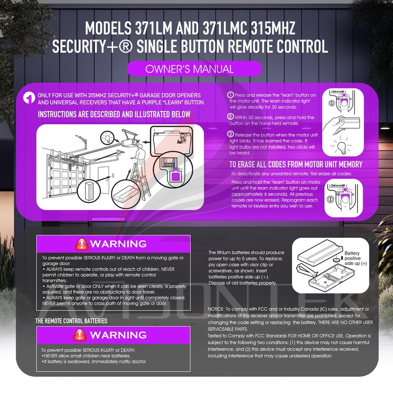 **Compatibility**:Works only for a PURPLE Learn Button of manufactured from (2005-2013) Liftmaster/Chamberlain Garage Door Opener Security+.Replacement for 371LM,950CD.
