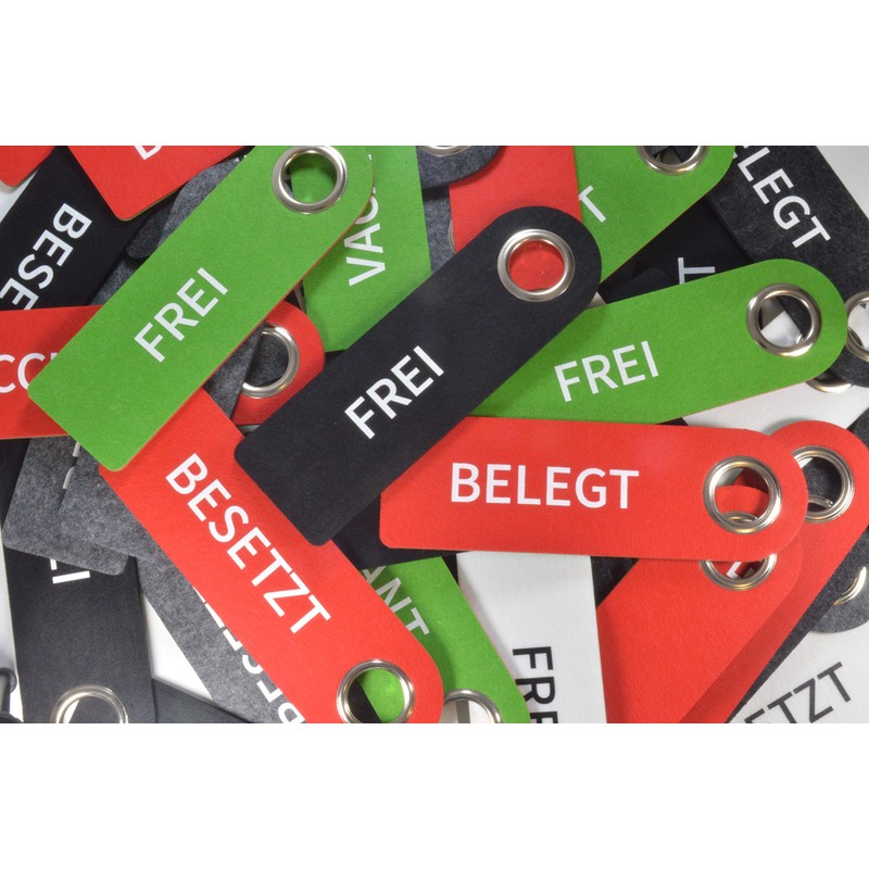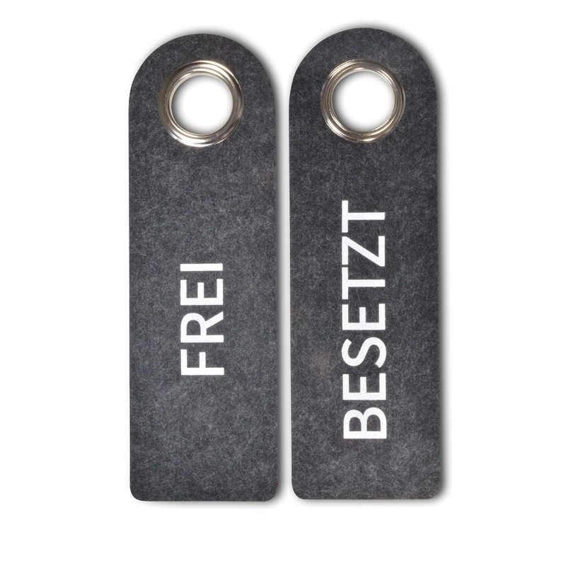 - Price hit: 2 free door handle signs (dark grey) – each printed on both sides: front with inscription "FREI", back with inscription "Besetzt"